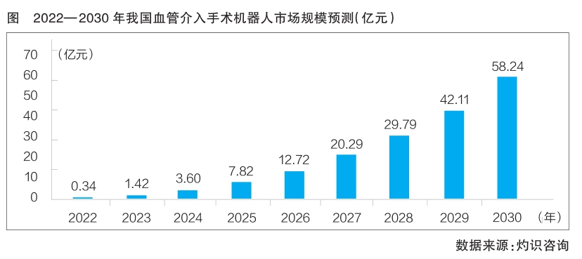 我国血管介入手术机器人行业虽起步较晚,但其市场规模增长潜力巨大。灼识咨询数据显示,预计今年我国血管介入手术机器人市场将达到0.34亿元,并将于2030年达到58.24亿元;2022—2030年复合年增长率为90.3%,超过全球血管介入手术机器人市场规模增速(详见图)。
